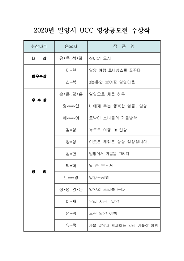 2020 밀양시 UCC 영상공모전 장려상_정O영