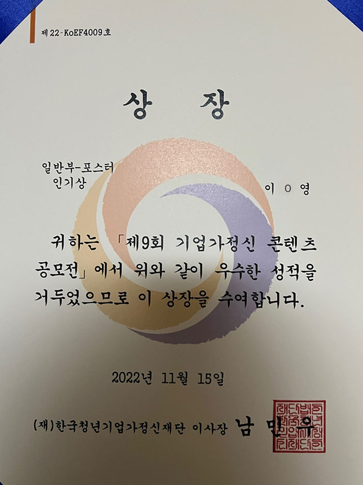 기업가정신 콘텐츠 공모전 인기상 수상_이O영