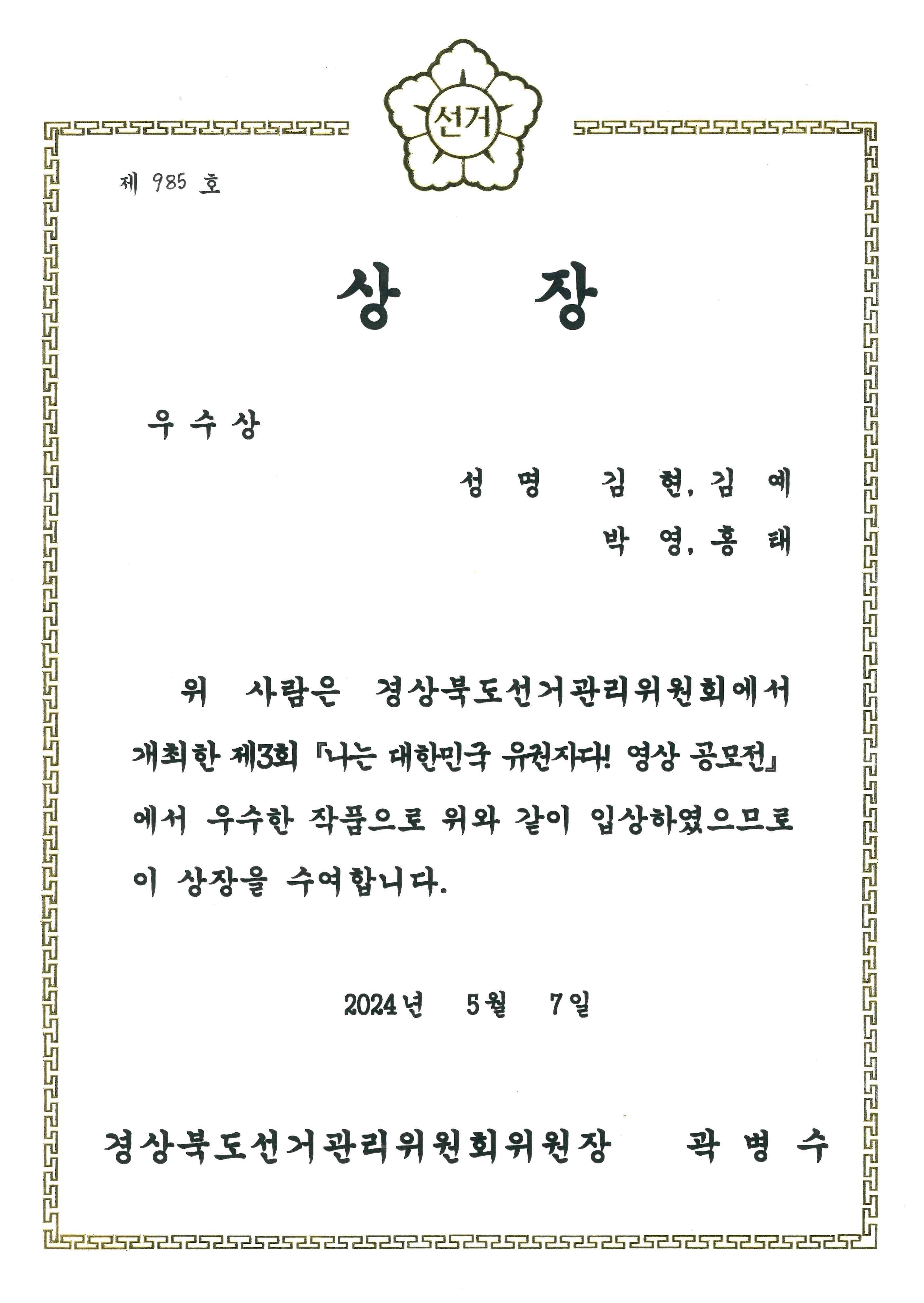 제3회 '나는 대한민국 유권자다' 영상공모전 우수상 수상작!!