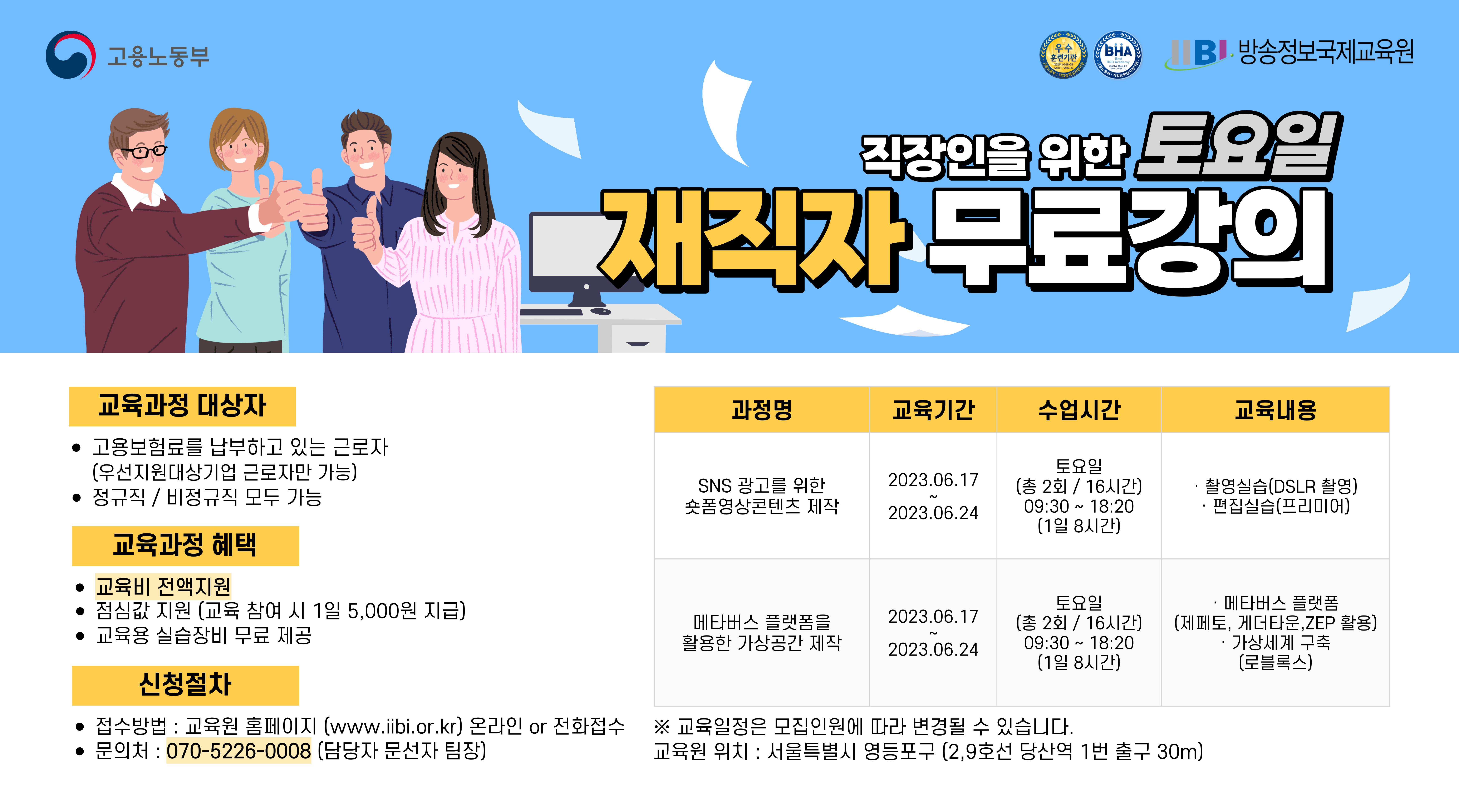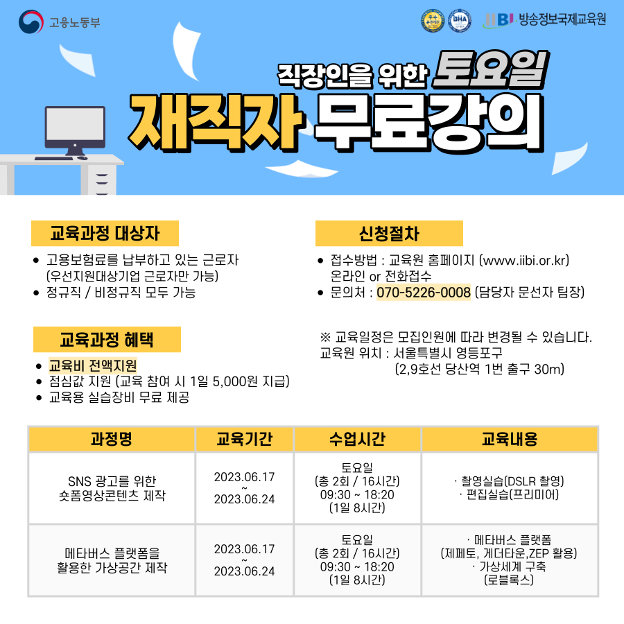 안녕하세요. 방송정보국제교육원입니다. 국비무료 주말교육 과정을 추천드리고자 합니다. 재직자를 위한 교육과정 상세내용 보시고 관심있는 분들은 교육원으로 연락주시기 바랍니다. . 과정안내 SNS광고를 위한 숏폼영상콘텐츠 제작 메타버스 플랫폼을 활용한 가상공간제작 . 신청하기 [교육기관] 한국디지털컨버전스협회 부설 방송정보국제교육원 [위 치] 서울시 영등포구 당산동 더빌 2층(당산역 1,3번 출구 도보 1분 이내) [과정문의] 02-2658-1131