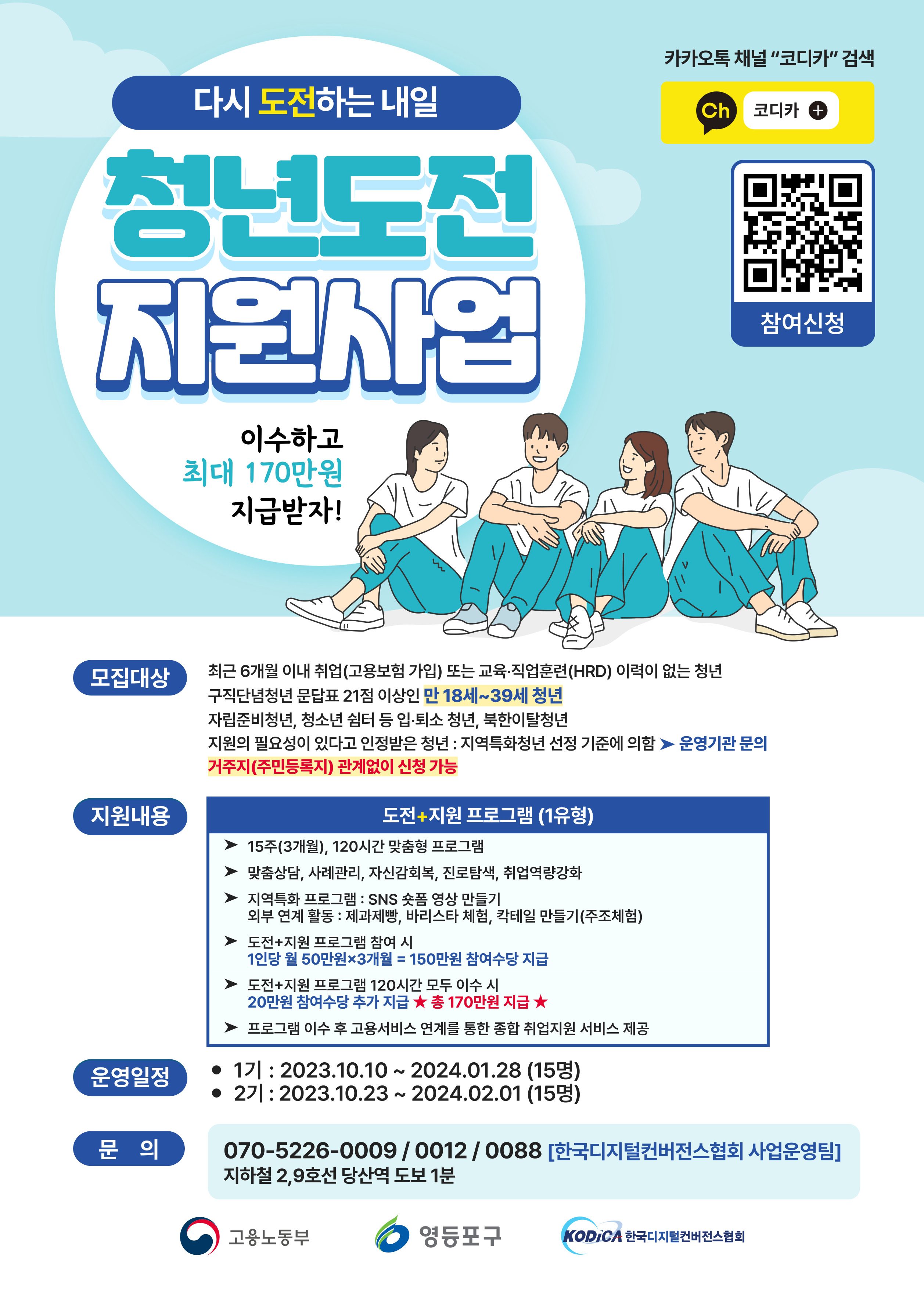 문의 : (사)한국디지털컨버전스협회 청년도전 지원사업 담당자 (융합사업부 사업운영팀) 전화 : 070-5226-0009 / 070-5226-0012 / 070-5226-0088메일 : jhl@kodica.or.kr / kyn1868@kodica.or.kr / job234@kodica.or.kr