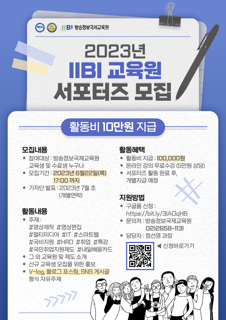 안녕하세요. 2023년 방송정보국제교육원 서포터즈 모집합니다. 많은 참여 부탁드립니다. [ 모집대상 ] · 방송정보국제교육원 교육생 및 수료생 누구나 참여 가능해요. . 신청기간 : 2023년 6월 22일(목) 17시까지 #영상제작 #영상편집 #멀티미디어 #IT #스마트웹 #국비지원 #HRD #취업 #특강 #국민취업지원제도 #내일배움카드 등 교육원 및 제도 소개 및 V-log 형식 자유 주제 [ 활동혜택 ] 활동비 지급(개인당 100,000원) + 온라인강의 무료수강(5만원 상당) * 서포터즈 활동 완료 후, 지급 예정 기자단 발표 : 3월 초 / 개별연락 [ 활동내용 ] .블로그 포스팅 월 4회(필수) *교육원 및 제도 소개 / 자유 주제 [ 지원방법 ] . 구글폼으로 신청하기