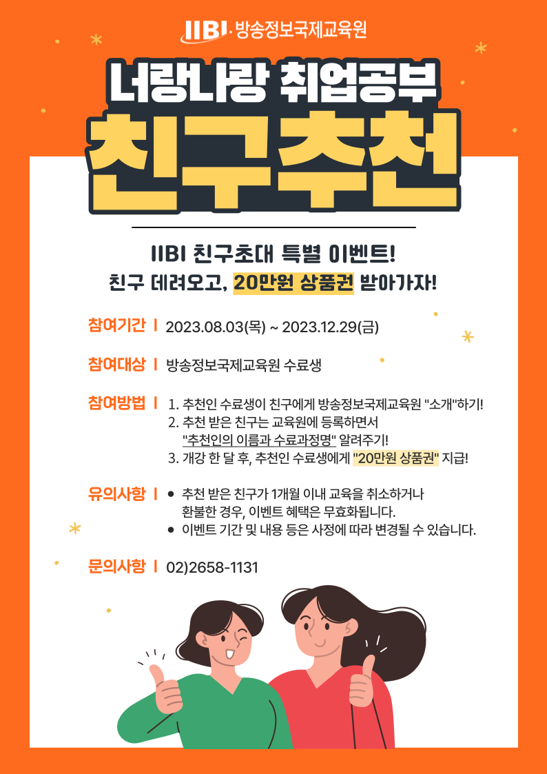 안녕하세요. ‘너랑나랑 취업공부 친구추천’ 특별 이벤트를 진행합니다. 친구들을 초대하여 친구가 교육 받으면 개강 한달 후, 20만원 상품권을 드립니다. 진행기간: 2023년 8월 3일부터 12월 29일까지 (기간은 상황에 따라 변동될 수 있습니다.) 참여대상: 방송정보국제교육원 수료생 참여방법: 1. 추천인 수료생이 친구에게 방송정보국제교육원 소개하기 2. 추천 받은 친구는 교육원에 등록하면서 추천인의 이름과 수료과정명 알려주기 3. 개강 한 달 후, 추천인 수료생에게 20만원 상품권 지급 유의사항: 추천 받은 친구가 1개월 이내 교육을 취소하는 경우, 상품권 혜택은 무효화됩니다.