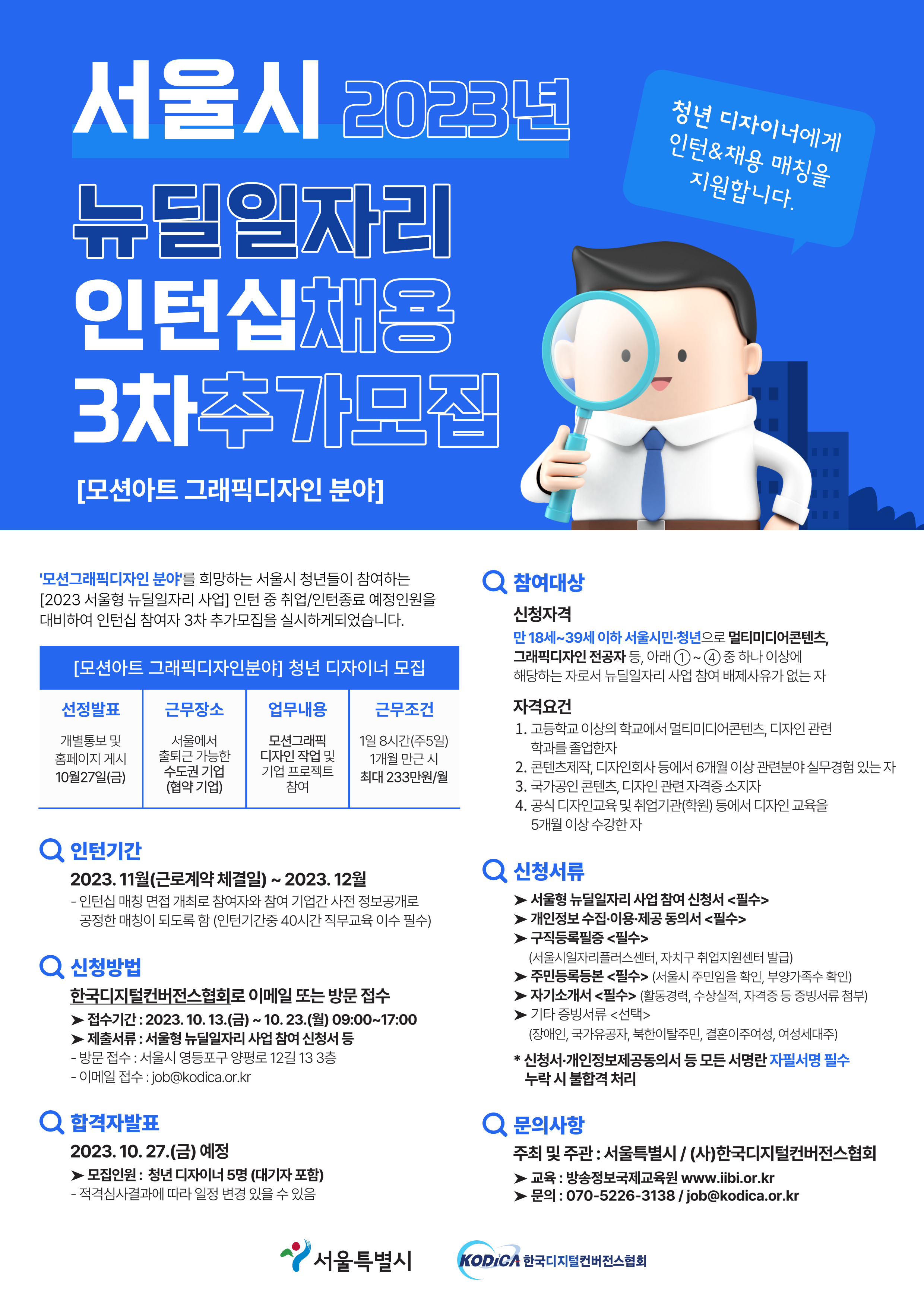 본 사업은 서울특별시의 2023년 서울형 뉴딜일자리 디자인분야 취업업계형 사업으로써 (사)한국디지털컨버전스협회가 '모션그래픽디자인 분야' 취업을 희망하는 서울시 청년 구직자를 대상으로 뉴딜 인턴&채용 매칭을 지원합니다. 아래와 같이 참여자를 추가 모집합니다.