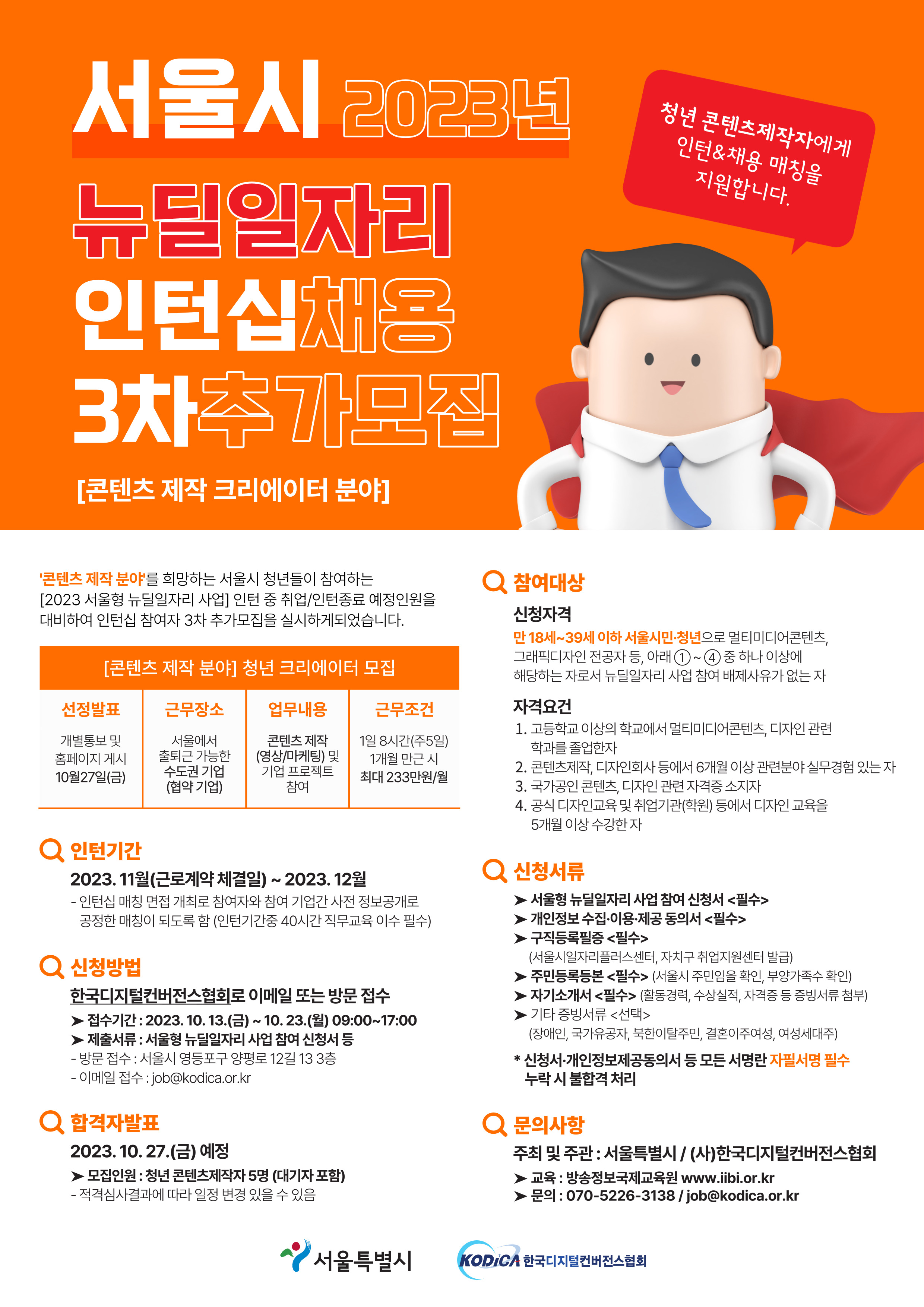 ■ (추가)참여자 모집개요 ○ 사 업 명 : ‘콘텐츠 제작을 위한 청년 크리에이터 취업연계형 사업’ ○ 사업내용 : 콘텐츠분야 현장 경험을 원하는 인력을 관련 기업에 배치하여 경력 형성 지원 및 역량강화 기회 제공 ※ 약 5개월 간 콘텐츠제작 기업에 배치되어 근무할 예정 ○ 근무기간 : 2023. 11월(근로계약 체결일)~ 2023. 12. 30.(예정) ○ 모집규모 : 청년콘텐츠제작자 약 5명(대기자 포함) ○ 모집대상 : 당해연도 중 만 18세 이상 만 39세 이하의 서울시민이자 콘텐츠제작 관련분야 전공자로서 사업 참여배제 사유가 없는 자 ※ 자세한 신청자격은 아래 모집공고의 ‘신청자격’ 확인 ○ 주 최 : 서울특별시 ○ 주 관 : (사)한국디지털컨버전스협회