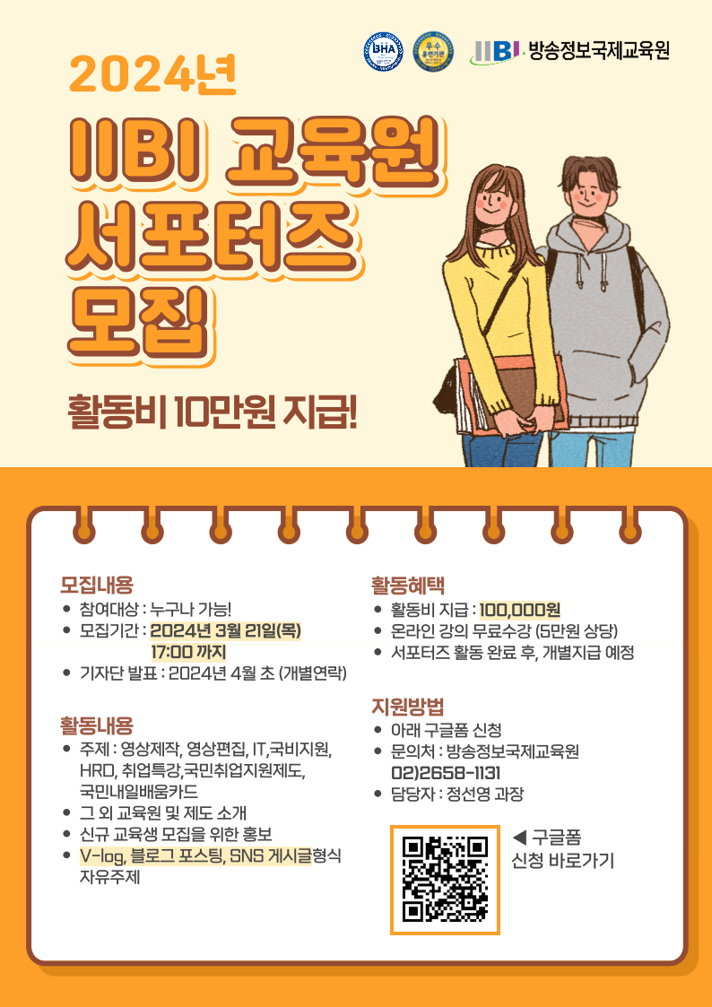 안녕하세요. 2024년 방송정보국제교육원 서포터즈 모집합니다. 많은 참여 부탁드립니다. [ 모집대상 ] · 방송정보국제교육원을 홍보할 분들은 누구나 참여 가능해요. . 신청기간 : 2024년 3월 21일(목) 17시까지 #영상제작 #영상편집 #멀티미디어 #IT #스마트웹 #국비지원 #HRD #취업 #특강 #국민취업지원제도 #내일배움카드 등 교육원 및 제도 소개 및 V-log 형식 자유 주제 [ 활동혜택 ] 활동비 지급(개인당 100,000원) + 온라인강의 누리잡 무료수강(5만원 상당) * 서포터즈 활동 완료 후, 지급 예정 기자단 발표 : 4월 초 / 개별연락 [ 활동내용 ] .블로그 포스팅, SNS 게시글 *교육원 및 제도 소개 / 자유 주제 [ 지원방법 ] . 구글폼으로 신청하기