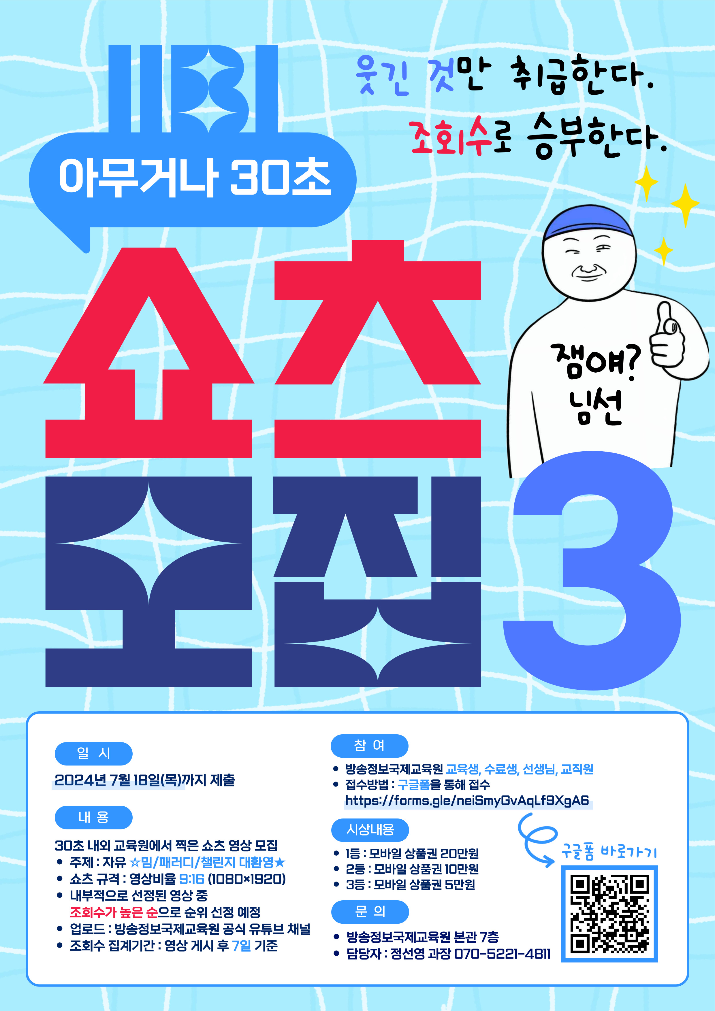 내용 - 30초 내외 교육원에서 찍은 쇼츠 영상 모집 - 주제 : 자유☆밈/패러디/챌린지 대환영★ - 쇼츠 규격 : 영상비율 9:16 (1080×1920)
