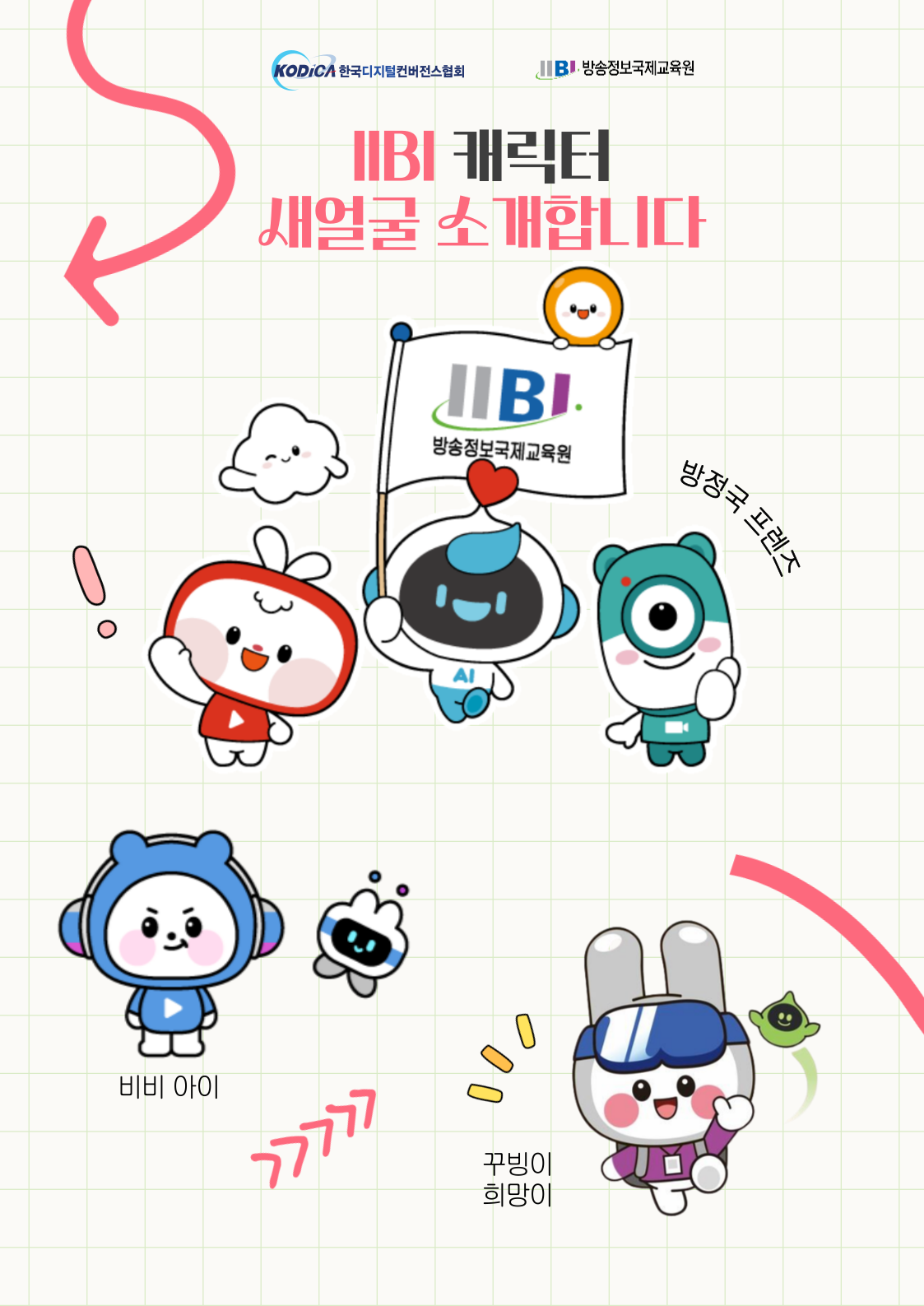 IIBI 캐릭터 새 얼굴을 소개합니다. MZ 뉴미디어 시대를 이끌어 갈 꿈과 열정의 방정국 프렌즈는 새로운 친구와 함께 꿈을 키우고 성장합니다. 다재다능한 '미아'는 따뜻한 마음과 열정으로 새로운 미디어 세상을 꿈꾸고 세상 모든 것을 담아 함께 공감하고 교감하는 '카노'는 다양한 영상기술 능력자입니다. 스마트한 AI기술로 미아와 카노를 도와주는 척척박사 '똑이'는 언제나 든든한 친구입니다. 꿈과 상상력 대마왕 '꾸미', 참신한 아이디어 뱅크 '아띠'와 함께 꿈과 미래를 방송정보국제교육원에서 만들어갑니다. 뉴미디어 창작자라는 꿈을 가지고 취업 준비를 하던 '비비(BB)'는 어느 날 수상한 영상을 발견하고, 그 영상을 클릭하자 뉴미디어로 가득한 뉴미디시티로 빨려 들어가게 됩니다. 그 곳에서 비비(BB)는 코칭 로봇 '아이(I)'를 만나 현실에선 겪을 수 없었던 다양한 경험으로 취업의 꿈에 한 발짝 다가가게 됩니다. 열정 가득 호기심 많은 곰돌이 비비를 통해 청년들이 꿈을 향해 나아가는 모습을 표현하였습니다. 방송정보국제교육원의 교육과정처럼 뉴미디어 세계의 아이가 비비를 전문가로 거듭나도록 교육시켜 성장하는 스토리를 담았습니다. IIBI 캐릭터 '꾸빙이'는 방송 취업을 꿈꾸는 학생들의 배웅의 열정과 희망에 의해 탄생한 IIBI의 꿈을 향한 취업청년요정입니다. IIBI의 II를 모티브로 한 커다란 귀로 선생님의 강의를 귀담아 듣고 B모양의 메타버스, 그리고 취업을 향한 굳은 의지를 상징하는 사원증을 늘 목에 걸고 있습니다. 그리고 영화슬레이트 모양의 배낭 속에 담긴 꿈과 희망, 열정을 학생들과 나누며 서로 격려하며 꿈을 이루어 나갑니다. 서브 캐릭터 '희망이'는 꾸빙이의 노력의 땀방울과 콘텐츠 제작의 AI가 융합하여 탄생한 희망의 싹을 틔우는 꿍과 희망의 씨앗 요정으로 학생들과 함께 꿈과 희망을 향해 성장합니다. 캐릭터 꾸빙이(꿈+방송정보국제교육원 + ing : 꿈을 향해 ing 현재 진행 중인 방송정보국제교육원의 청년을 의미합니다.), 희망이입니다.