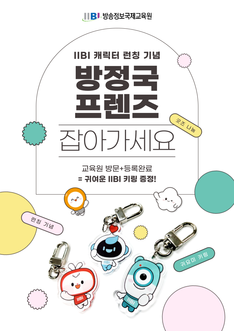 안녕하세요! 방송정보국제교육원을 방문 후 등록해 주신 분들을 대상으로 특별한 키링 증정 이벤트를 진행합니다. 참여 방법 및 혜택은 아래와 같습니다. 키링 증정 이벤트 참여 방법 방문 후 등록 : 방문하신 후, 원서 등록을 완료해 주시면 키링을 증정해 드립니다. 유의 사항 모든 혜택은 1인 1회에 한해 제공됩니다. 키링 증정은 방문 후 등록 및 조건 충족 시 현장에서 바로 수령 가능합니다. 많은 참여 부탁드립니다!