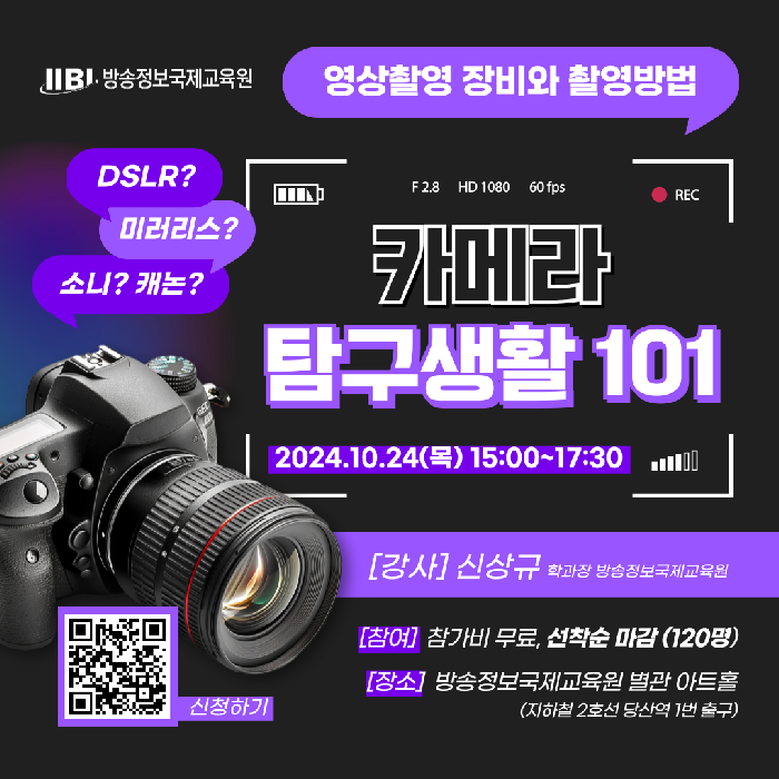 일시 : 2024년 10월 24일(목), 15:00~17:30 장소 : 방송장보국제교육원 서울시 영등포구 2,9호선 당산역 인원 : 참가비 무료, 선착순 마감(120명)
